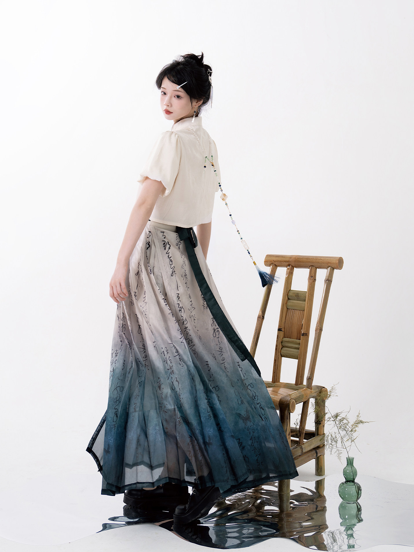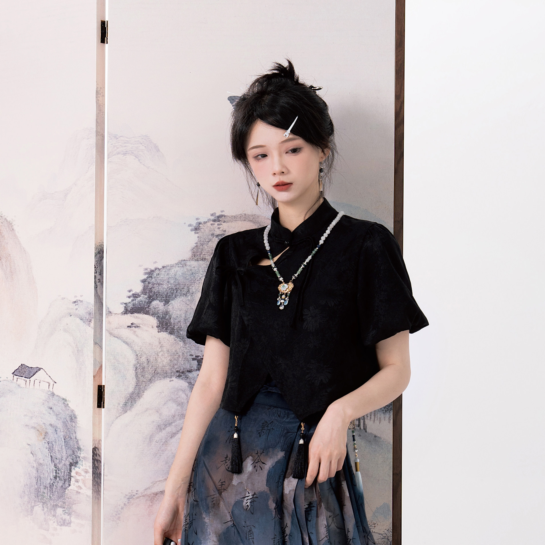 черная подвеска с кисточками, рубашка, ожерелье